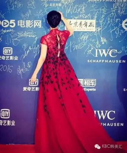 纱质红长裙上点缀着黑色亮片的织绣叶子,更是优雅