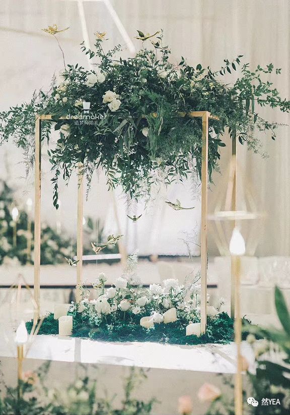 整场方案的颜色,采用了低饱和度的绿、粉、黄,是为了搭配北欧极简白。当然也存在折中的考虑:长辈们不能接受没有红色,其实最终现场的颜色也没有照片那么低饱和,幸好有大师后期调色。