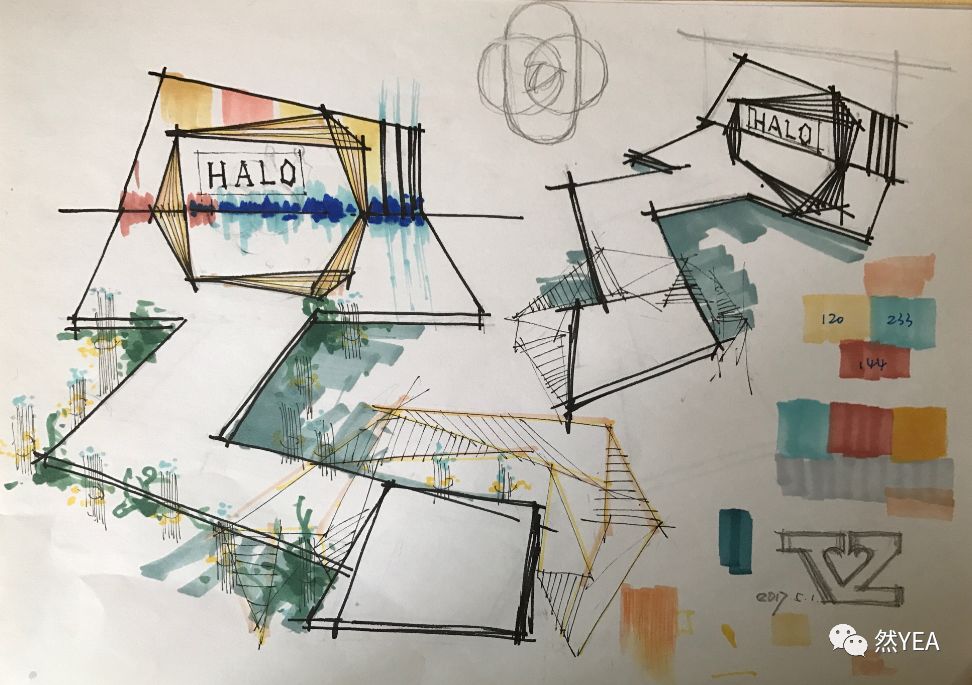 入场处的几何支架其实是我给造梦师出的难题。本来我想用几何形状来表达我意向中的HALO光环,造梦师给我的方案里将支架做成了“建筑构成作业”,回忆满满呀,哈哈,是一份礼物。