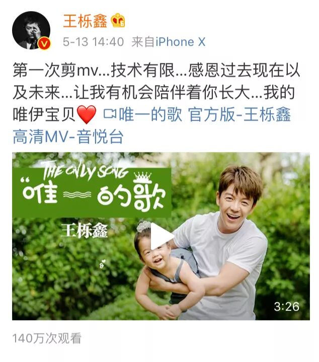 除了和好兄弟互相调侃,王栎鑫的微博基本都在晒孩子。而且还为了小孩去学了剪辑,自己第一次剪了一个MV,真的是太用心了。