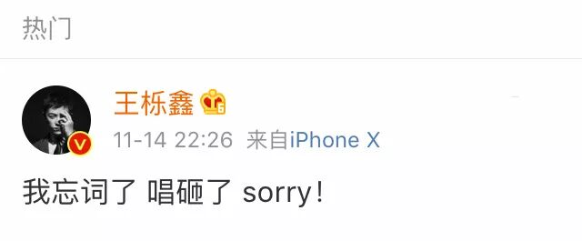 今天,王栎鑫发了一条微博:“我忘词了 唱砸了 sorry!”