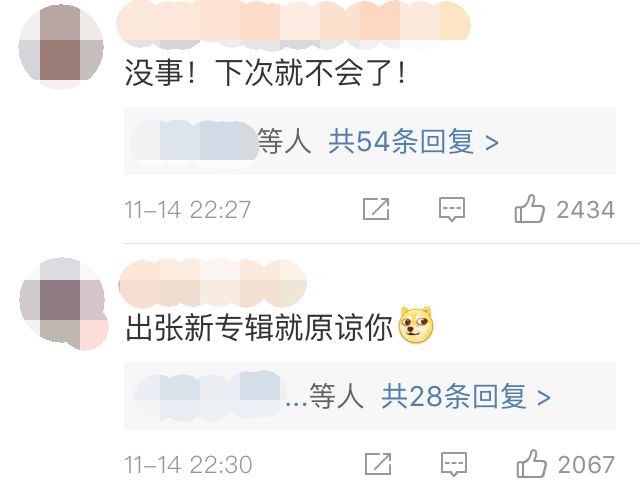 粉丝的评论都很暖心:“没事!下次就不会了!”“出张新专辑就原谅你”“孕傻三年,没事的”“没关系鸭 你是最棒哒~”“忘词说明不是假唱hhhhhhh”