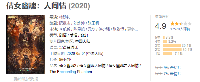 露个大腿,就敢挑战王祖贤了? 影视烂番茄 港台女星 2020-05-09 20:10:18 1008 创作不易,用心坚持,欢迎请BaGua喝几杯爱心咖啡!打赏并支持本文 打赏并删除本文 电影院终于要开门了。看到这个消息相信大家都很振奋,但具体什么时候开门,仍是一个未知数。这时候就体现出网大的优势了,疫情期间,线上看电影不失为一种选择。今天要介绍的这部出自林珍钊之手。这是一个致力于玩5毛特效的网大导演。接连两部《大蛇》一度被认为引领网大走向“灾难”时代。要知道,在平时,这种片子都是扑得悄无声息。如今电影院关门,再加上他这次拿到了《倩女幽魂》这样一个经典IP。就算不给我林导三分薄面,大家也一定很好奇。这部“鬼片”到底还能拍成啥鬼样?倩女幽魂:人间情论成绩,这部电影无疑是成功的。短短4天冲上了网络票房分账的榜首,如果把它换算成院线的分账比例,相当于4天就收获了5300万票房。但要是论口碑,豆瓣评分仅有4.9,是有史以来评分最低的一版。《倩女幽魂》的“魂”,就在于聂小倩这个角色,没选好整部戏就废了大半。要怪就怪王祖贤起点定的太高,只需惊鸿一瞥,后来者再怎么模仿都是稍显黯淡。最近被誉为乘(兴)风破(作)浪的代言人刘敏涛,尚且能驾驭这种媚而不骚。到了杨幂这里就稍显稚嫩、幼态明显。大S更不用说,造型雷人,还带点杉菜的憨。最具争议的应该就是刘亦菲,美则美矣,人设却被魔改得毫无灵魂。谁能想到新版一出,突然就觉得之前的版本也没什么好挑剔的了。平心而论,这个小演员的颜值不差,在一众网红脸里还算有点辨识度。可惜气质不对,努力白费。就像是陈妍希明明是一名美女,却把小龙女演成了小笼包一样。这版的聂小倩也属于带点婴儿肥的包子脸,不做表情的时候有点呆,像是智力有待开发。稍微做点表情吧,脸上的肉又会挤在一块,变得扭曲狰狞。宁采臣的扮演者陈星旭大家应该比较熟悉了。《东宫》里重拳出击,谈恋爱吗?灭你全族的那种。到了《倩女幽魂》却是唯唯诺诺,嘴里疯狂念叨着我读书人不近女色。这两人可能各有演技,但凑到这一部电影里的化学反应,简直堪称是灾难级别。聂小倩就像一名误入歧途的女大学生,顶着一张清纯脸,行为举止透露着一种窘迫感。你看这个撩大腿的动作。再看这个投怀送抱的水平。一点也看不出是吸人阳气的女鬼,我猜一定是姥姥安排的业务还不够熟练。对比王祖贤,就能看出什么才叫风情。而宁采臣也丝毫没有书生该有的儒气,顶着这熬了八百年的黑眼圈,看起来倒更像“空虚公子”一些。虽然电影是讲“人间情”,但留给男女主的戏份是真的不多。这就导致宁采臣对聂小倩的好感像乘了火箭般突突往上蹿,毫无说服力。见一次扒裙,见两次发春梦,见第三次就要为爱献身,简直是在用生命泡妞。谈情的时机不对,也没了内味。原版为了不被姥姥发现,聂小倩顺势一倒把宁采臣吻进水里。外面危机四伏,水中却是暗流涌动,在这种紧张的氛围下人鬼之间的偷情更容易让人着迷。而新版则是在和姥姥大战的时候,突然深情告白顺便接个吻。拜托都看见你俩了,这已经不是偷情,而是在打明牌,搁姥姥面前秀恩爱呢?要不是有燕赤霞在,就俩人这么个秀法撑不过10分钟。其实这部戏有很大的分量放在了燕赤霞这个角色身上,倒不如改名为《倩女幽魂之燕赤霞》更贴切些。请“包租公”元华来扮演,也是最为正确的选择,至少要比男女主要适合得多。虽然如今特效变多了,很多打戏不需要太大动作,但单凭元华比划那么两下,还是能看出功底来的,至少不再是软绵绵的慢镜头了。徐少强扮演雌雄同体的姥姥,也很好的诠释了那股劲劲的感觉,眼神里都是戏。这也是翻拍经典的一贯手法,要么请原版演员来收割情怀,要么请几个老戏骨作配来拉高演技平均值。《倚天屠龙记》让周海媚从周芷若升级做灭绝师太,《新白娘子传奇》让叶童从许仙化身为许母。元华和徐少强其实也承担了一部分情怀,不过不是代表原版,而是把你拉回那个港片盛行的时代回忆里。尤其港鬼片更是一骑绝尘,是继《柯南》《包青天》之外的又一大童年阴影。反观国内拍“鬼”,一直就是个笑话。明明特效什么的都是一流,却还在沉迷一惊一乍的表面惊悚。据说这部网大砸了3800万,科技和钱都跟上了,也确实有些镜头完成得不错。黑山老妖派人来迎亲的那段,一群吹着唢呐的阴兵让人背脊一凉。一时间你分不清这到底是喜事还是丧事。弱水渡船的画面甚是绝美,就是渡船人一抬头,有那么一点像吕子乔是怎么回事。这是东方传统审美下的恐怖元素。而当憋了大半部黑山老妖终于出场,却发现他原来是一个巨型石头怪。燕赤霞钻进黑山老妖肚子里捅破心脏的时候,周围满是亡灵之手。这又有点西方化、现代化恐怖元素的感觉了。东西结合的想法是好,但导演对氛围的掌控依然不足,少了那么点“妖气”。老港鬼片即使特效辣眼睛,也依然是惊悚的。一个是港鬼片很爱用黏糊糊的不知名液体,来营造一种咸湿的感觉,一看就不是阳间的玩意。还有一个是服化道尽可能用更多的薄纱,鼓风机一吹衣服仿佛活了一样,若隐若现的帷幔也可以自带朦胧感。要不然怎么又把鬼叫做“阿飘”呢?不得不感慨,那时候的电影就是艺术,每一帧都值得细细琢磨。而新版的服装堆了好几层厚厚的布料,像cosplay,显得笨重了不少。怪不得这个聂小倩