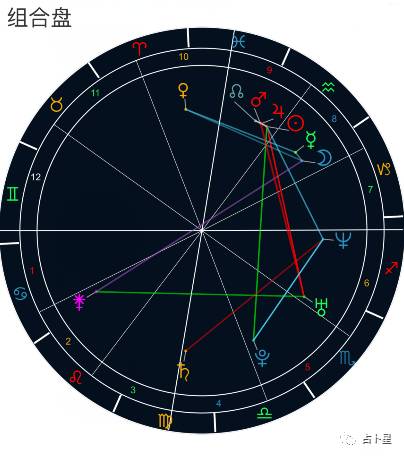 这是一种相互理解的模式。组合盘上还有群水瓶中的北交水瓶刑了天王,天王拱婚神,说明他们的婚姻在外人看来是有少许的评价的,褒贬不一,同时也惊讶他们的结婚事实。