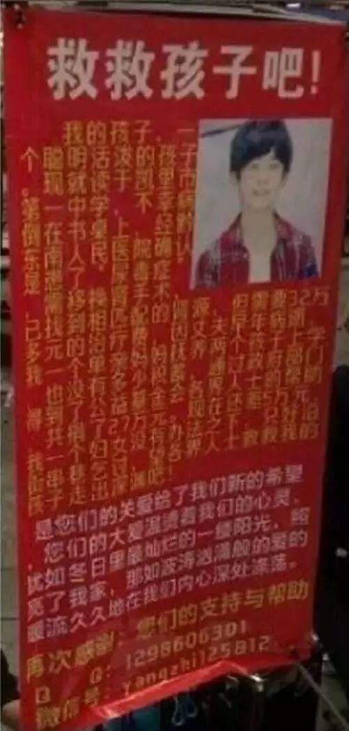 “我的孩子聪明活泼,就读于XX中学,却不幸病倒在书桌上,医院诊断为尿毒症,需要32万换肾,公益基金捐了27万,就差5万了……救救孩子吧!”