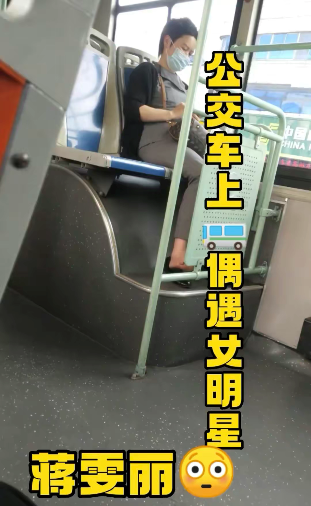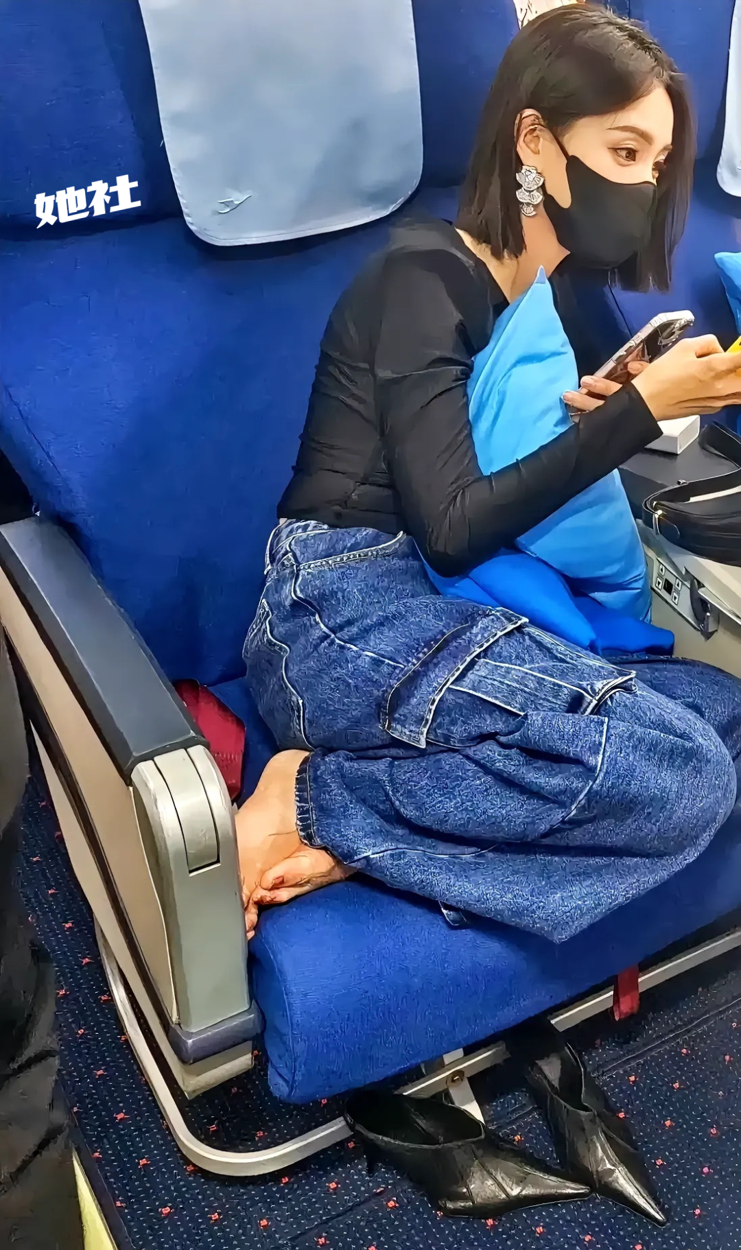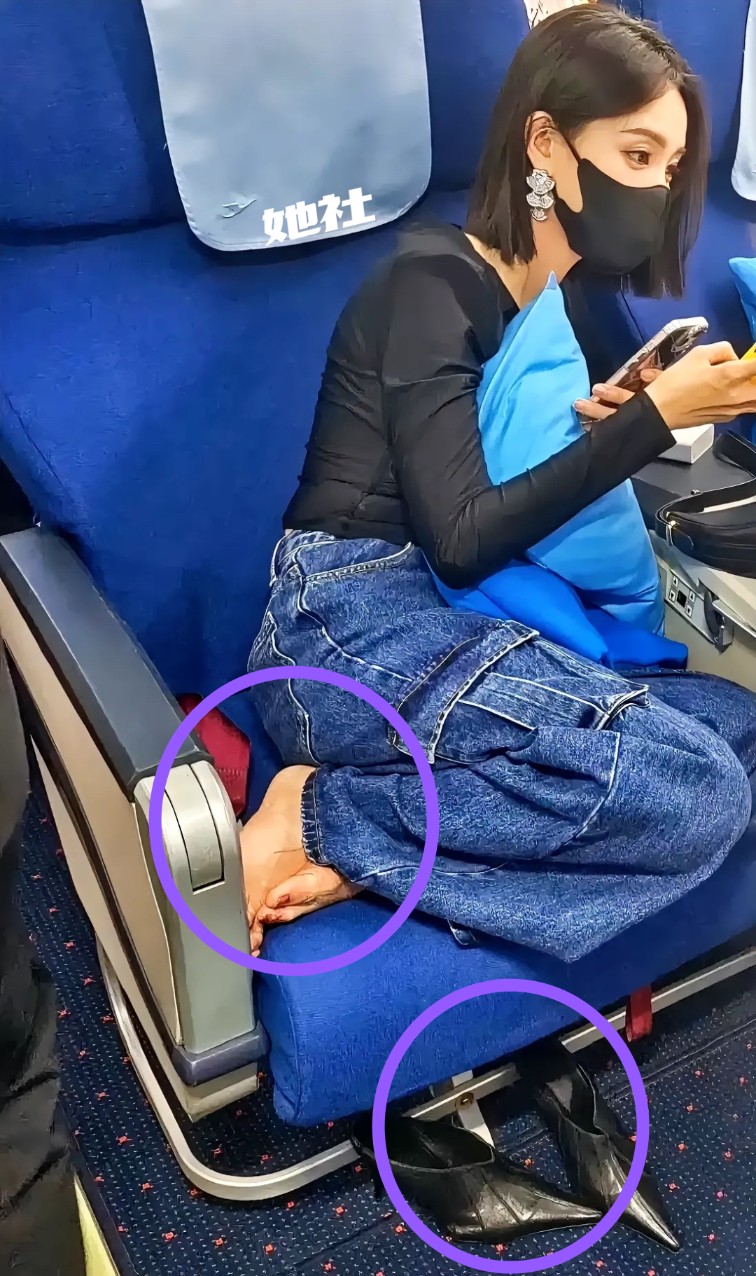 照片中,她脱下鞋子光脚蜷缩在座位上,一双黑色高跟鞋放在座位下。