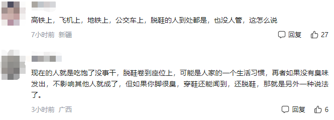 有说她不讲卫生,对四周的乘客也是一种不尊重,穿着鞋子也是最基本的礼貌。