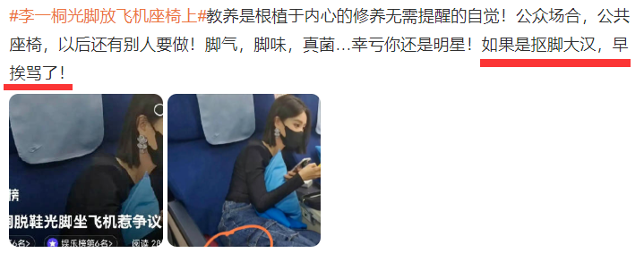 网上开始了热火朝天的讨论,舆论呈现两种观点:一方认为李一桐在飞机上脱鞋的行为缺乏公共礼仪和文明素养,会对公众形象产生负面影响,引发模仿效应。