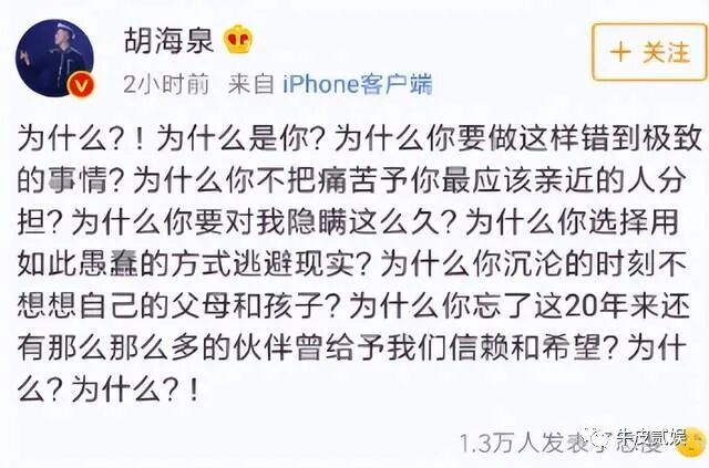 陈羽凡出事后,胡海泉百思不得其解,这老哥再一次发挥了自己的文学功底,直接用了“十万个为什么”来反问羽凡。