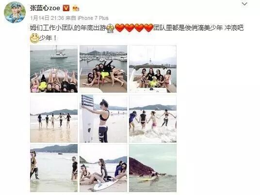 话说到了年初,各位工作了的小婊贝们年终福利和年终奖都发了吗?昨天张蓝心可是晒出了一组带着团队员工坐游艇出海游玩的照片。