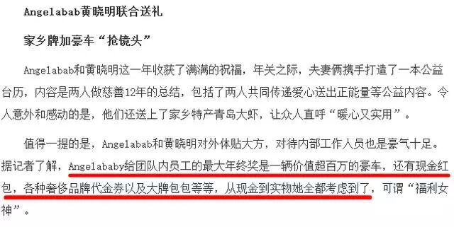 另外,Angelababy给员工的最大年终奖是一辆价值超百万的豪车,还有现金红包、各种奢侈品牌代金券以及大牌包包等。跟了这俩口子,真是吃喝不用愁啊。