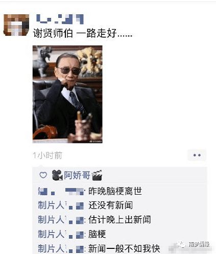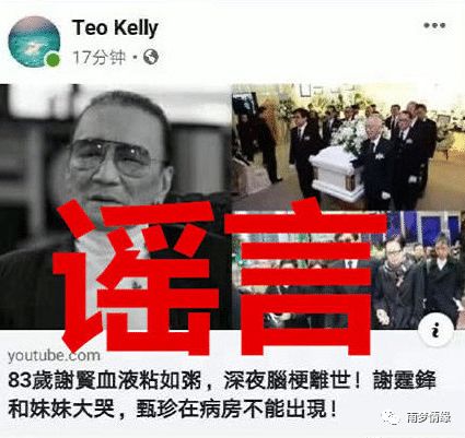 网上曝出83岁高龄的谢贤死于脑梗死深夜,标题写着“83岁高龄的谢贤血粘如粥,深实业脑梗死去世,谢霆锋和他的妹妹哭了,真真不能出现在病房”,引起了激烈的争论。这有媒体向英皇这边核实,对方反驳传言说是“假的”,还说“四哥很健康和朋友吃饭,所以不用担心。”