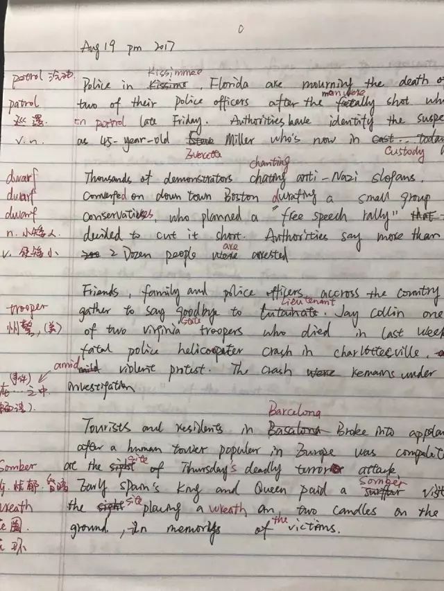 最后不要忘记根据第二天的听写原文进行校对,整理学习新的单词词组等用法。