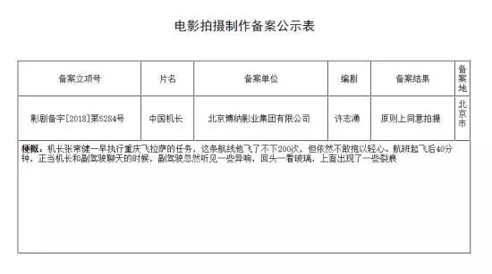 据悉,电影《中国机长》目前正在紧张筹备。今年8月博纳影业集团备案拍摄《中国机长》的项目信息曝光,引发网友高度期待。