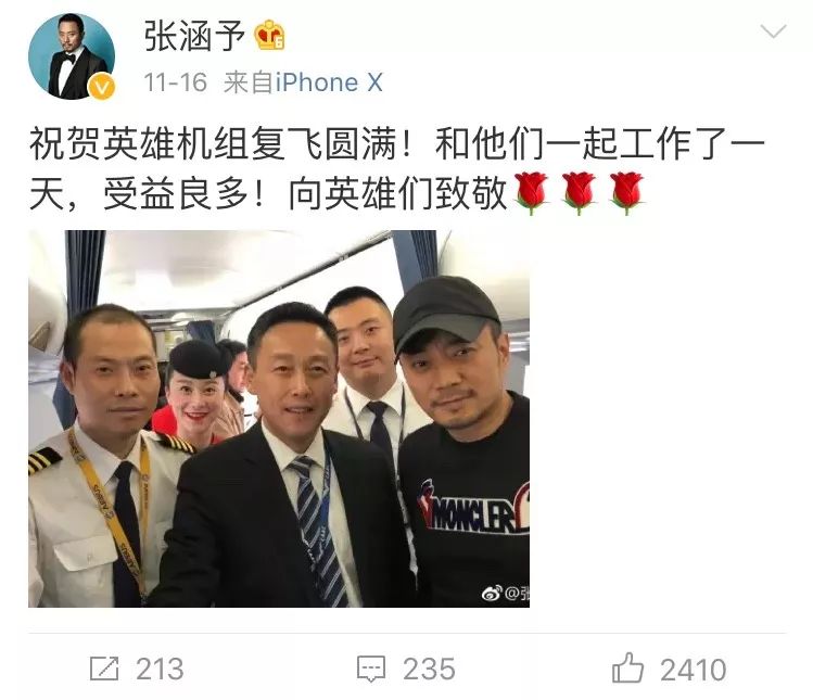 “祝贺英雄机组复飞圆满!和他们一起工作了一天,受益良多!向英雄们致敬。”16日,演员张涵予在微博上发布了和机组成员的合影,证实了自己将饰演“英雄机长”。