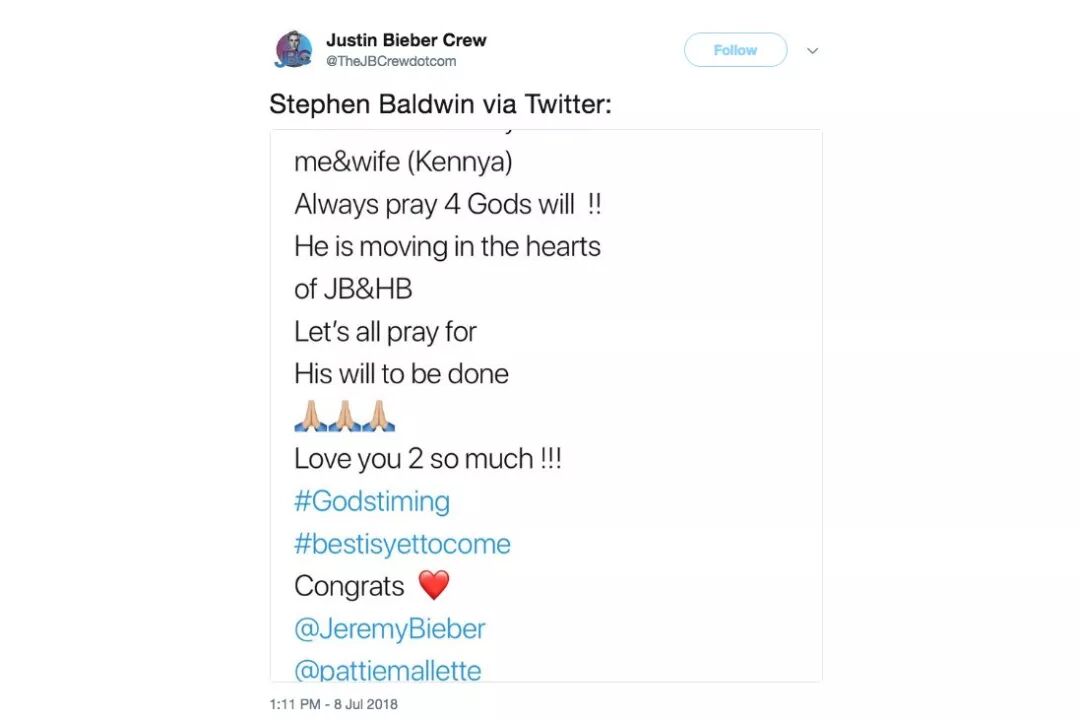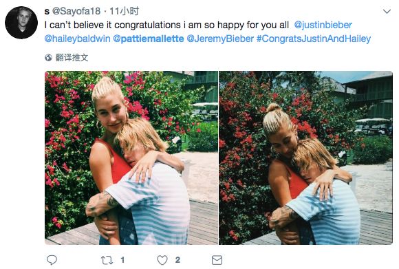Justin 的母亲 Pattie Mallette 也在 Twitter 帐户中分享了多个「Love」字样,而 Jeremy Bieber 亦曾在 Twitter 发表了大篇文章,内容是表达他对儿子与 Hailey Baldwin 的祝福,最后还加入恭喜及心型图片,令二人订婚的消息更为明显且确定,这条Twitter后来虽然被删了但已被截图。