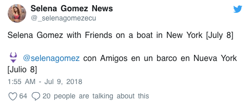 Selena正在和朋友在纽约的海域上面放松心情,看得出她心情不错,也没有受到JB订婚消息的影响。可能对于两人来讲,虽然永远是藏在心里最深处的一个人,但人始终要长大,试着放下可能对于彼此来讲会变得更好吧。