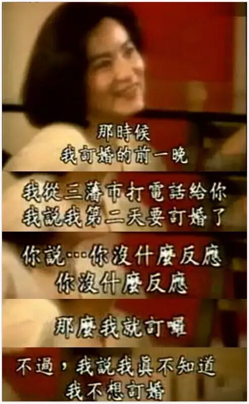 “我在香港拍了十年戏,1984年到1994年,我每天就感觉,好像在一个荒岛一样。我觉得我好孤独,我觉得好像每天就这样。工作,回来,工作,回来,我很寂寞。我就很想要一个港口,要有一个家。这时候就出现了一个人,就给了我这个感觉。让我很有安全感,让我觉得我到了一个很安全的港口,所以我交往了半年,就决定结婚了。他就有一个信念,就是对我好。那时候我就觉得好像是天上的星星月亮,他都可以满足你。”