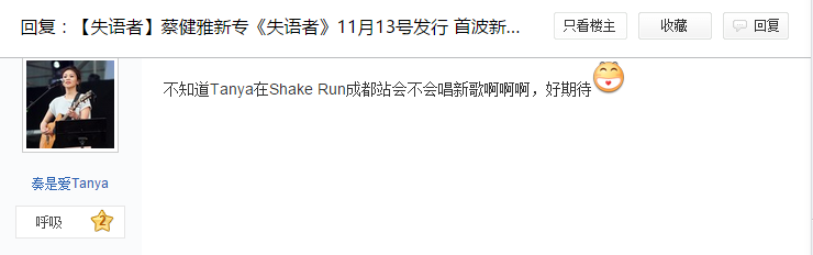 由于正巧近期要发新专辑,贴吧上早就已经对她的新歌讨论的热火朝天了。而在今天,正好放出了一版新单曲30s的试听。不知道在10月31日的成都Shake Run现场,会不会带着自己的新歌悄悄让歌迷们一饱耳福呢?