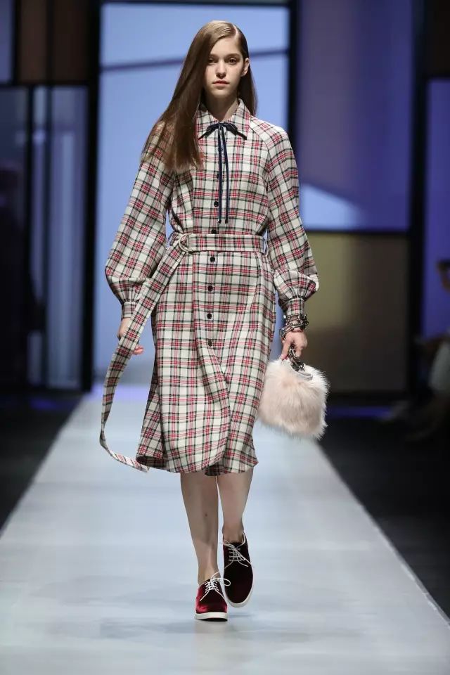 复古式的西装外套、高腰长裤和格纹套装都可见英国马术装剪裁灵感,夸张的灯笼袖、潇洒的阔腿裤和大伞裙勾勒出这一季的主打轮廓。