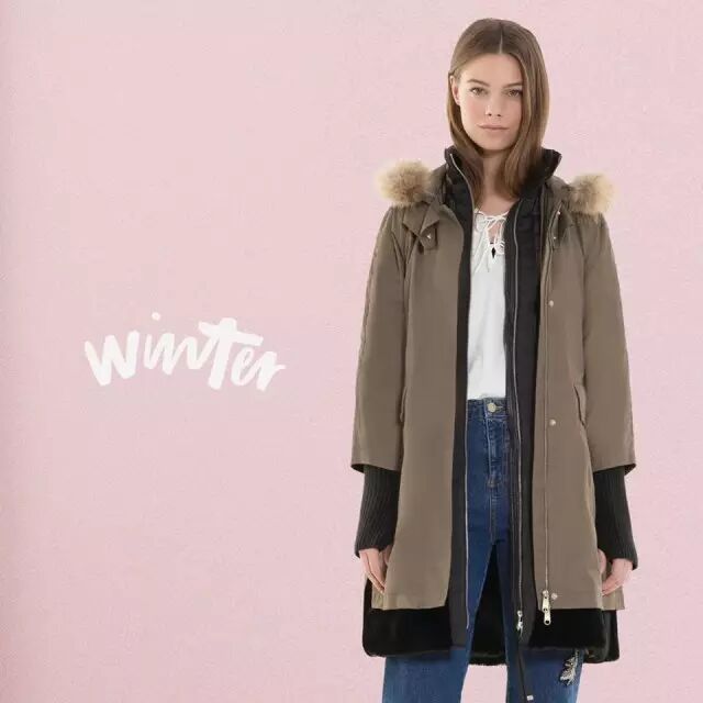 冬天,化纤华达呢派克大衣内衬羽绒里,毛茸茸的帽檐包裹肩颈,给人一种暖化的感觉。