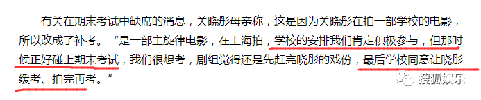 关妈妈说关晓彤确实没有参加期末考试,但原因是她正在拍一部学校的微电影,和校方协商好会进行补考。