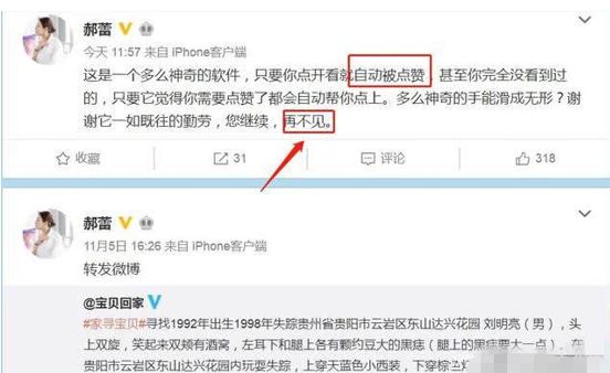 因为微博总是多次喜欢代替郝蕾点赞,郝蕾干脆不玩微博了,表示再不相见。