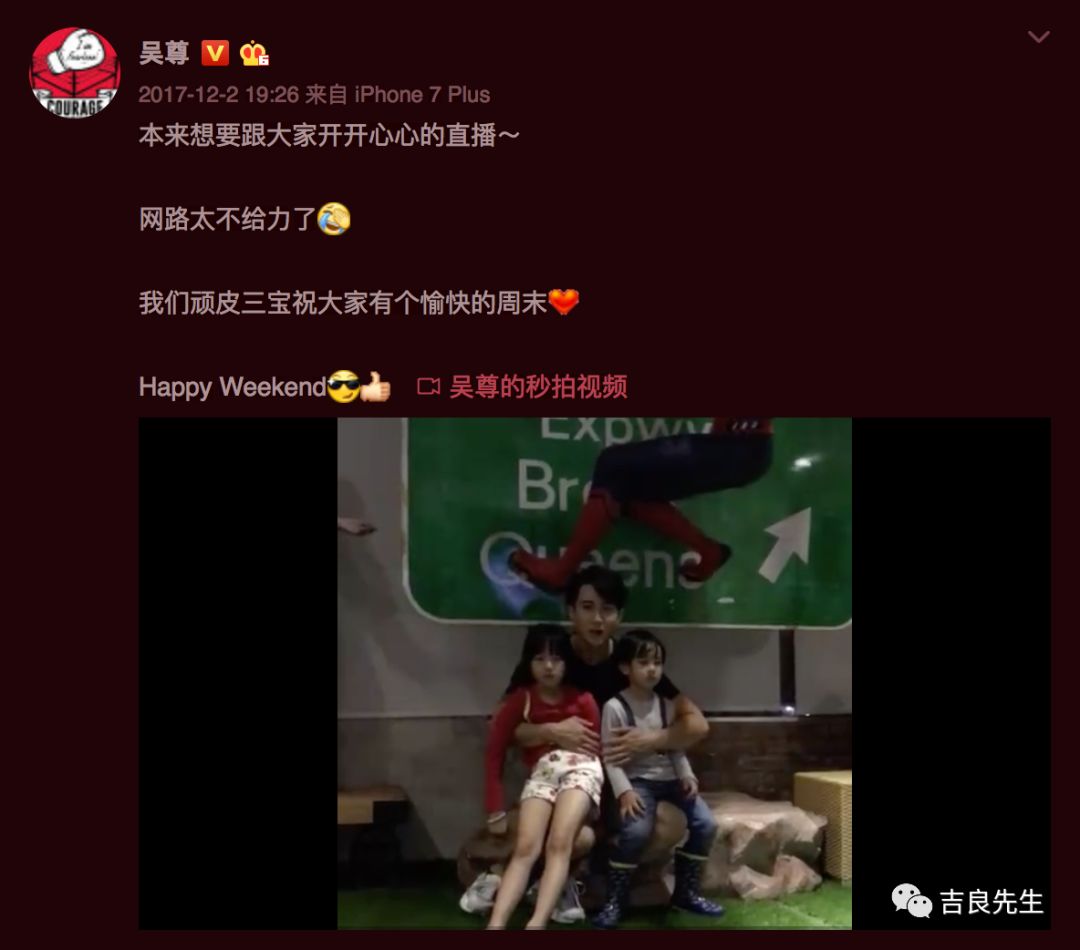 但家庭真的是给了吴尊更多的快乐,你看看他的微博就知道了。那里除了工作,就全是一双儿女的动态。