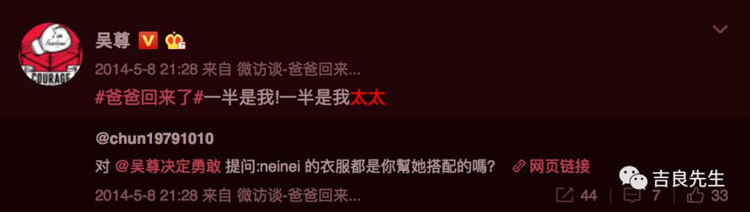 虽然吴尊十分坦然地与观众们分享他与孩子们的欢乐时光,但是你会发现,吴尊的微博中,只有这样一条提到太太林丽莹的微博: