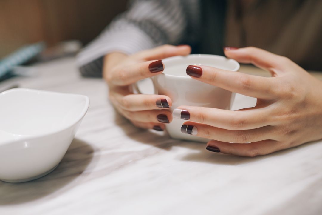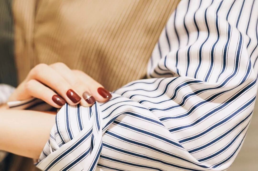 当然,最重要的是手指甲图案和不同的场合也要匹配。如果是上班上学,太闪亮或者太花哨了也很不合适。深红色、裸色、简单的条纹,是不出错又很安全的选择: