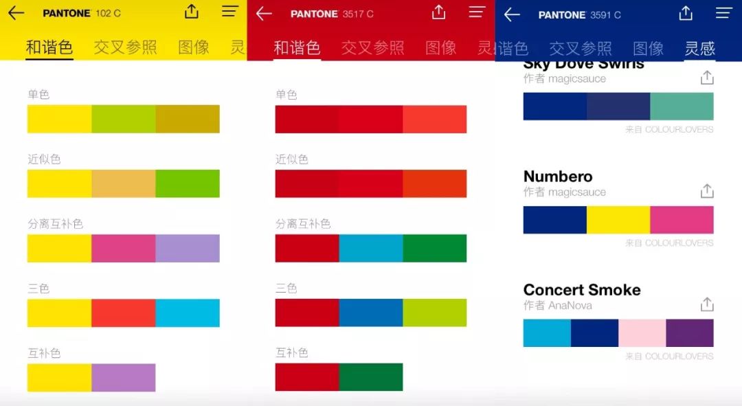 颜色的搭配方式太多了,很难一次说清楚。不过我可以提供一个配色捷径。手机里下载一个pantone的APP,可以查看每个颜色的和谐色与适合搭配的颜色: