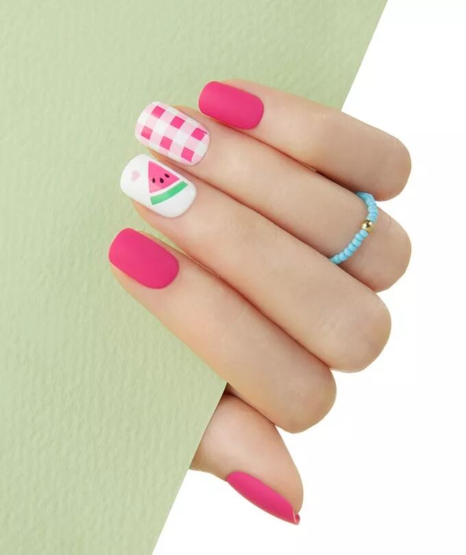 比如以前,纯色指甲也流行跳一个色,但往往一只手有一个手指跳色,而今年很多图样都是一只手跳两三个色,或者增加了花样图案: