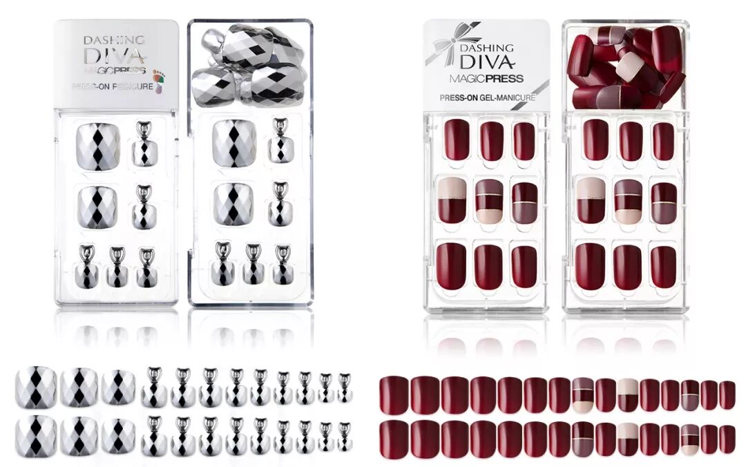 在每一个Dashing Diva 的指甲套装里,都有30片、12种size的指甲贴片。在脚指甲的套装里,也有24片、12种size的指甲贴片。