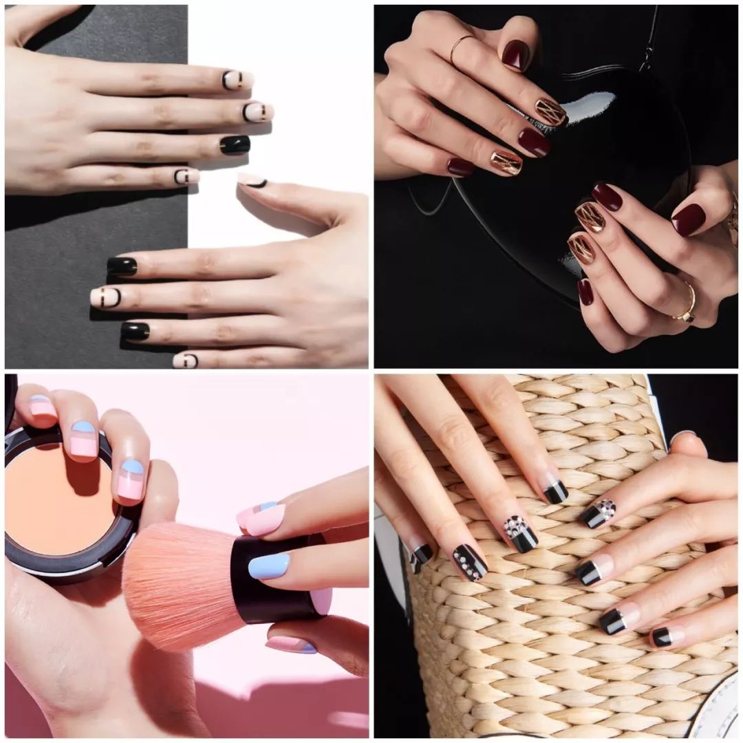 指甲图案的变化其实很有限,我曾经总结过,除了纯色外,指甲油的图案主要有这么几种,下方留白、条纹、几何形状、撞色……