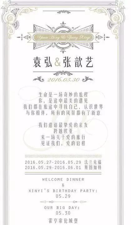 33岁的袁弘,未婚妻张歆艺大他1岁,3年前曾与导演杨树鹏结婚,但只维持1年5个月就在微博坦承离异,不久后就和袁弘公开恋情,袁弘对未婚妻显然十分宠爱,据喜帖上行程指出,将先在5月29日为她办生日派对,隔日就在气势磅礡的霍亨索伦城堡举办婚礼。