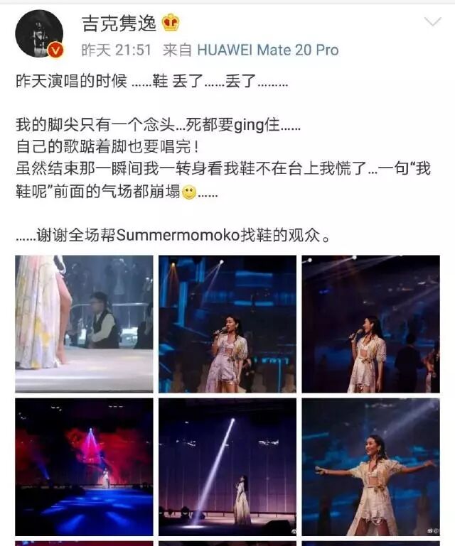 微博还表示,结束那一瞬间,一转身看鞋不在台上的时候就慌了,一句我鞋呢?哈哈,前面气场全崩,可以说是很考验敬业程度了,垫着脚也要唱完,哈哈。