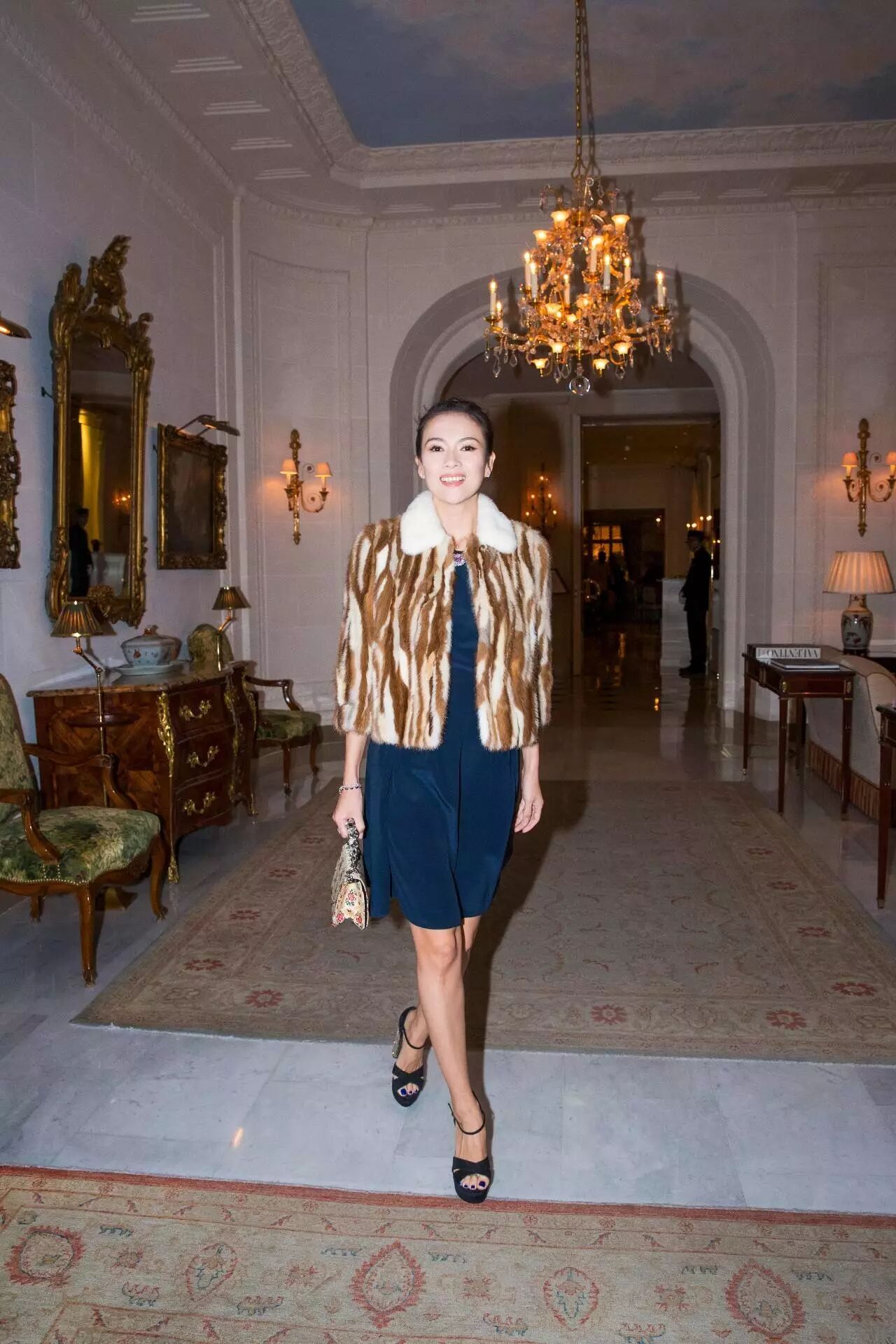 夜间气温骤降,出席Miu Miu私人晚宴,藏蓝色洋装外是雅致外套与水晶鞋跟高跟鞋。