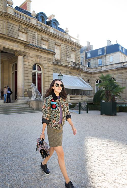 绣上徽章的印花棒球外套、格纹短裙,搭配Scenique墨镜和黑色平底鞋,这身打扮充满活力。
