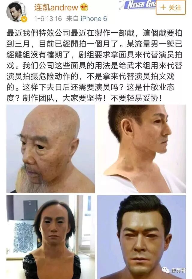 近日,演员连凯就实名爆料:某流量男一号已经离剧组没有档期了,剧组要求那演员面具来代替演员拍戏。并晒出了四张十分逼真的面具图,其中两张赫然是天王刘德华和巨星古天乐。连凯大理吐槽:“我们公司这些面具是给武术组用来代替演员拍摄危险动作的,不是拿来代替演员拍文戏的,照此以后,以后还需要演员吗?