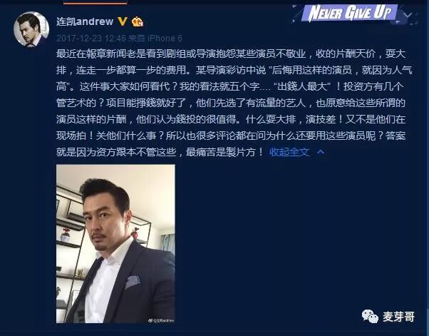 在12月23号,连凯就在微博声称:“最近在新闻总是看到剧组或导演抱怨某些演员不敬业,收的天价片酬,耍大牌,连走一步都算一步的费用,很多导演都在采访中说:“后悔用这样的演员,就因为人气高。”很多的导演也是有苦说不出,因为在演艺圈这样的现象太常见了,他们背后是巨额的观众流量,如果不用他们投资方不同意,收视率更加大打折扣。