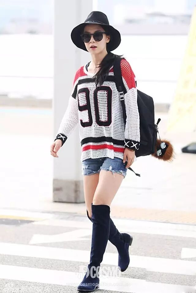 被称为韩国最美身材的宋智孝欧尼穿衣品味也不俗啊,镂空字母Tee搭磨边牛仔短裤+过膝长靴随性舒适而性感味道杠杠滴。