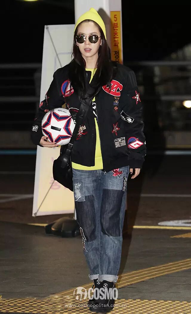 宋智孝私下穿搭不同于她出席活动的风格,你更多的看到她非常动感帅气的一面,拼接阔腿牛仔裤+棒球外套随性舒适。