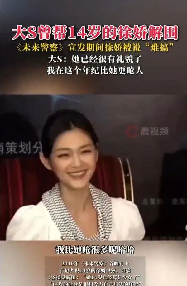 大S生前的善举并非偶然。 演员徐娇在悼念长文中提到了与大S在拍摄《未来警察》时的回忆。 2010年,在该片首映礼上,有记者当着时年14岁的徐娇的面说她“难搞”,大S立即挺身而出为徐娇解围。
