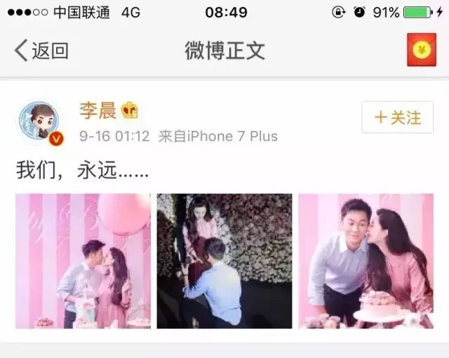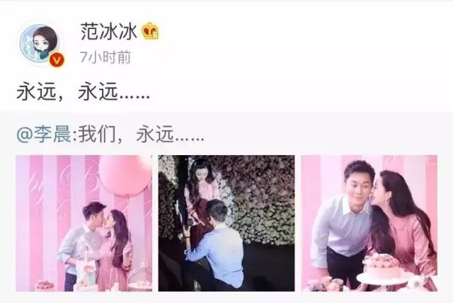 凌晨1点12分,李晨晒出一组成功求婚范冰冰的照片。