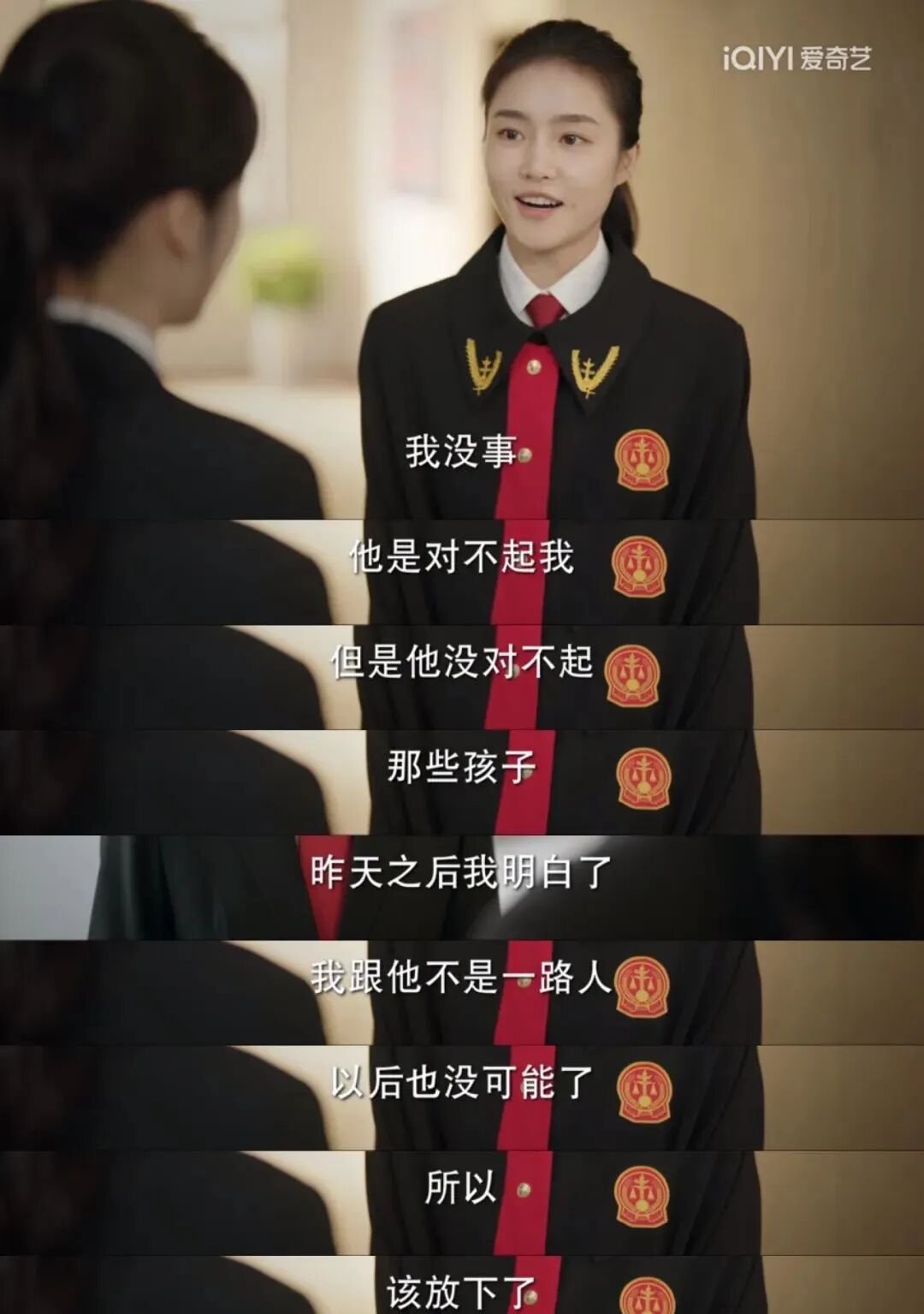 在剧中钟媛媛工作时会扎着高马尾,穿上一身黑色法袍面无笑意,直观上便有了正义使者的严肃模样,在庭上判决时思路清晰干脆利落,面对当事人的刁难也果敢无惧,不禁感慨原来青春可爱的脸也可以演沉稳和老练!