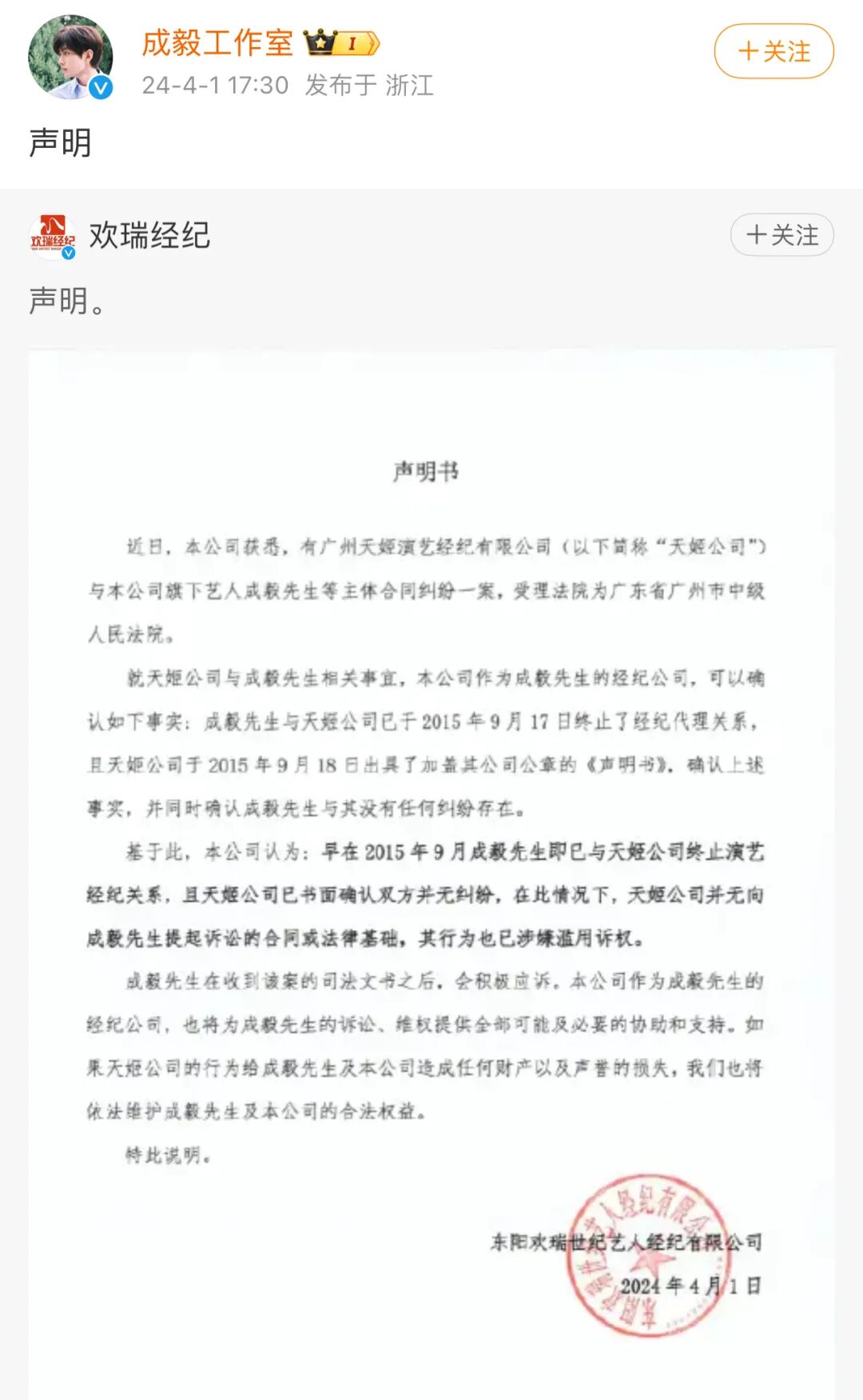 成毅被起诉,最新回应 南宁晚报 内地男星 2024-04-02 09:02:51 24 创作不易,用心坚持,欢迎请BaGua喝几杯爱心咖啡!打赏并支持本文 打赏并删除本文 热点新闻热浪滚滚!广西最高温或飙到40℃郑爽无财产可供执行,法院终结执行程序企查查APP显示,近日,成毅(傅诗淇)、永康琪圆影视文化工作室、厦门晨起琪圆影视传媒有限公司新增开庭公告信息。原告为广州天姬演艺经纪有限公司(星汇天姬),案由为合同纠纷,案件将于7月2日在广东省广州市中级人民法院开庭审理。公开信息显示,星汇天姬为成毅前经纪公司。2011年,成毅出演个人首部电视剧《唐宫美人天下》。2016年,因在古装仙侠剧《青云志》中饰演林惊羽而走红。2020年,凭借古装仙侠剧《琉璃》获得更多关注。2022年,主演的古装仙侠剧《沉香如屑》和《沉香重华》相继热播,有网友称其为古装男神。2023年,古装武侠剧《莲花楼》和都市剧《南风知我意》相继播出,获得百度沸点年度影响力男演员奖 。公开信息显示,永康琪圆影视文化工作室为傅诗淇(成毅)个人独资企业,厦门晨起琪圆影视传媒有限公司则由傅诗淇(成毅)持股99%。工作室最新回应4月1日下午成毅工作室发布声明回应早在2015年9月成毅先生即已与天姬公司终止演艺经纪关系,且天姬公司已书面确认双方并无纠纷,在此情况下,天姬公司并无向成毅先生提起诉讼的合同或法律基础,其行为也已涉嫌滥用诉权。成毅先生在收到该案的司法文书之后,会积极应诉。本公司作为成毅先生的经纪公司,也将为成毅先生的诉讼、维权提供全部可能及必要的协助和支持。如果天姬公司的行为给成毅先生及本公司造成任何财产以及声誉的损失,我们也将依法维护成毅先生及本公司的合法权益。END来源 | 广州日报综合自封面新闻、锦观新闻、@成毅、@成毅工作室编辑 | 陈钰榕责编 | 韦 玮编审 | 罗 琼点亮和持续关注↓↓↓ 创作不易,用心坚持,欢迎请BaGua喝几杯爱心咖啡!打赏并支持本文 打赏并删除本文 感谢您的支持鼓励,我会继续努力的!文章地址:用户邮箱:打赏金额:USDT 请输入数字点击”去打赏“,即可进行打赏支持本文章哦 成毅 发表评论