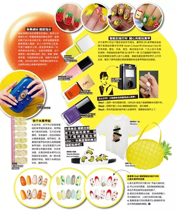 你准备怎么度过夏天最热的一个月?有人说躲在空调屋里吃西瓜、吃冰棒才是正经事。GRAZIA可要提醒你,小心肥肉长上身!炎夏也要美美的,就把水果元素装扮上吧!美甲、美衣,让甜甜的水果味道迷倒路人吧!