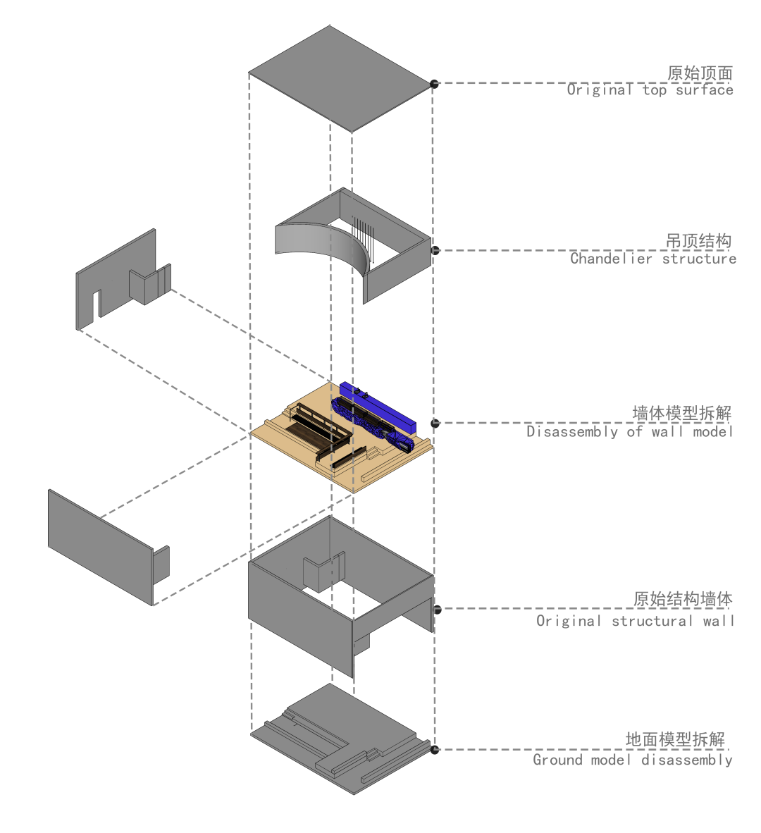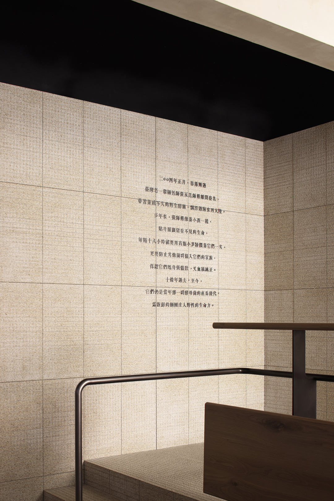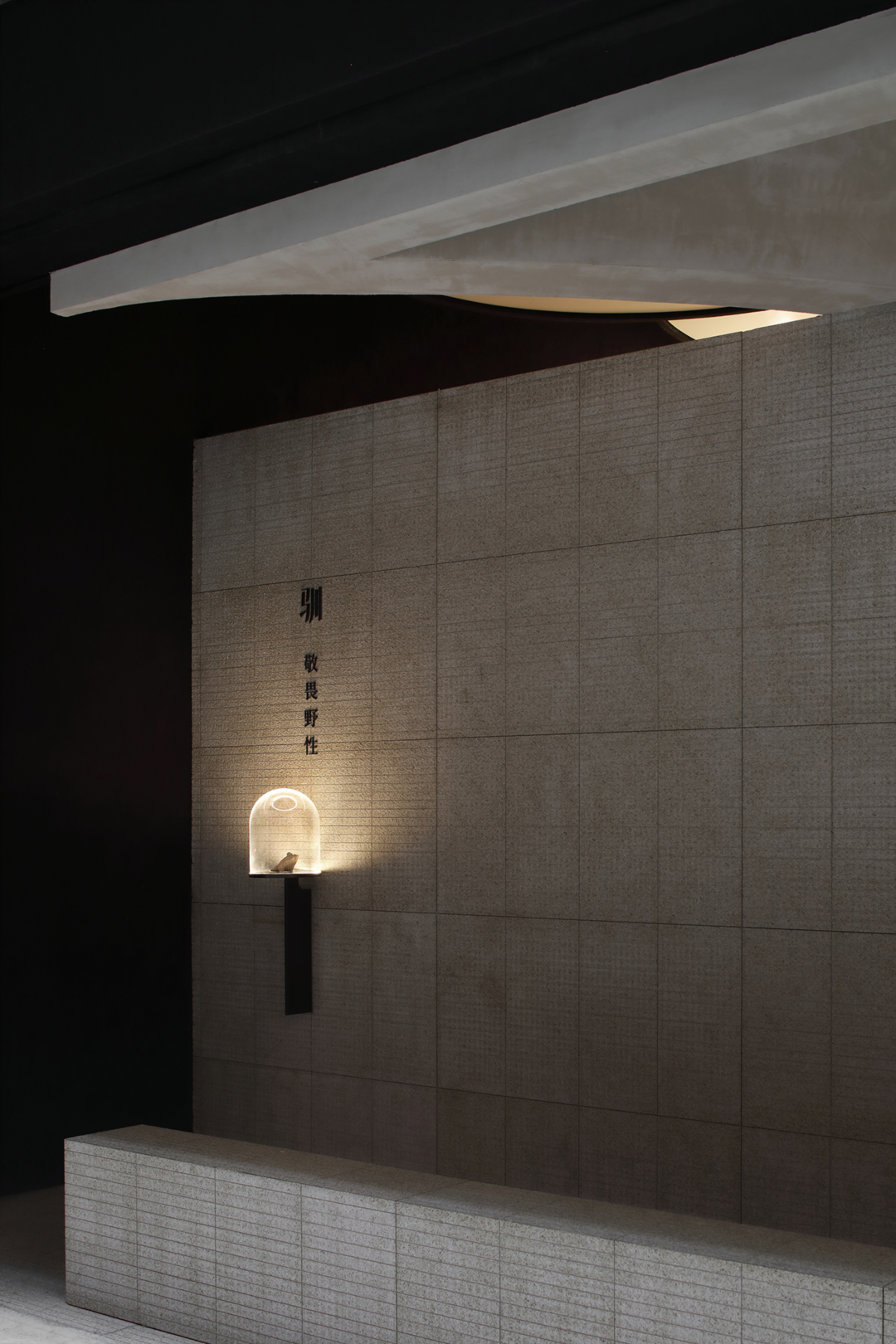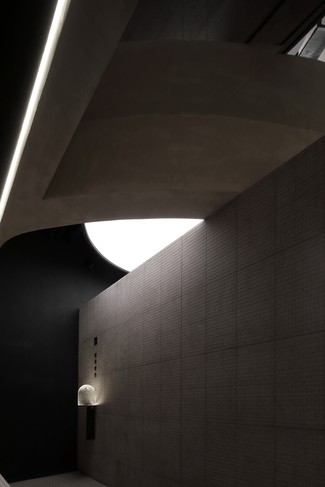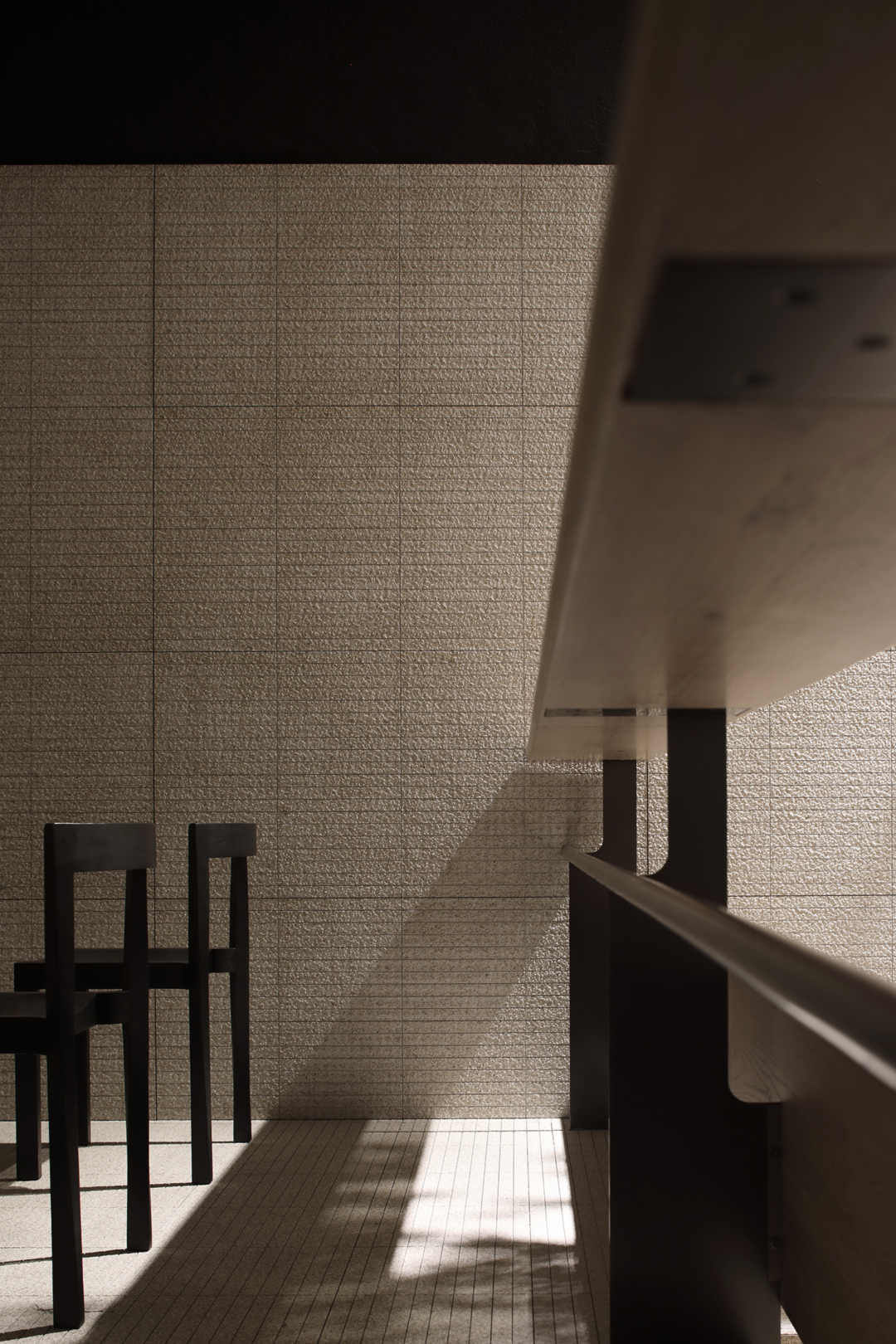 最后,加工所剩的石材废料全部打磨成粉末,与墙面腻子一起合成空间所专属的肌理涂料,用于2.4米以上的墙面及天花区域。
