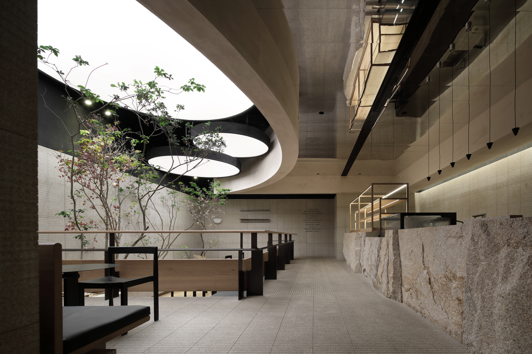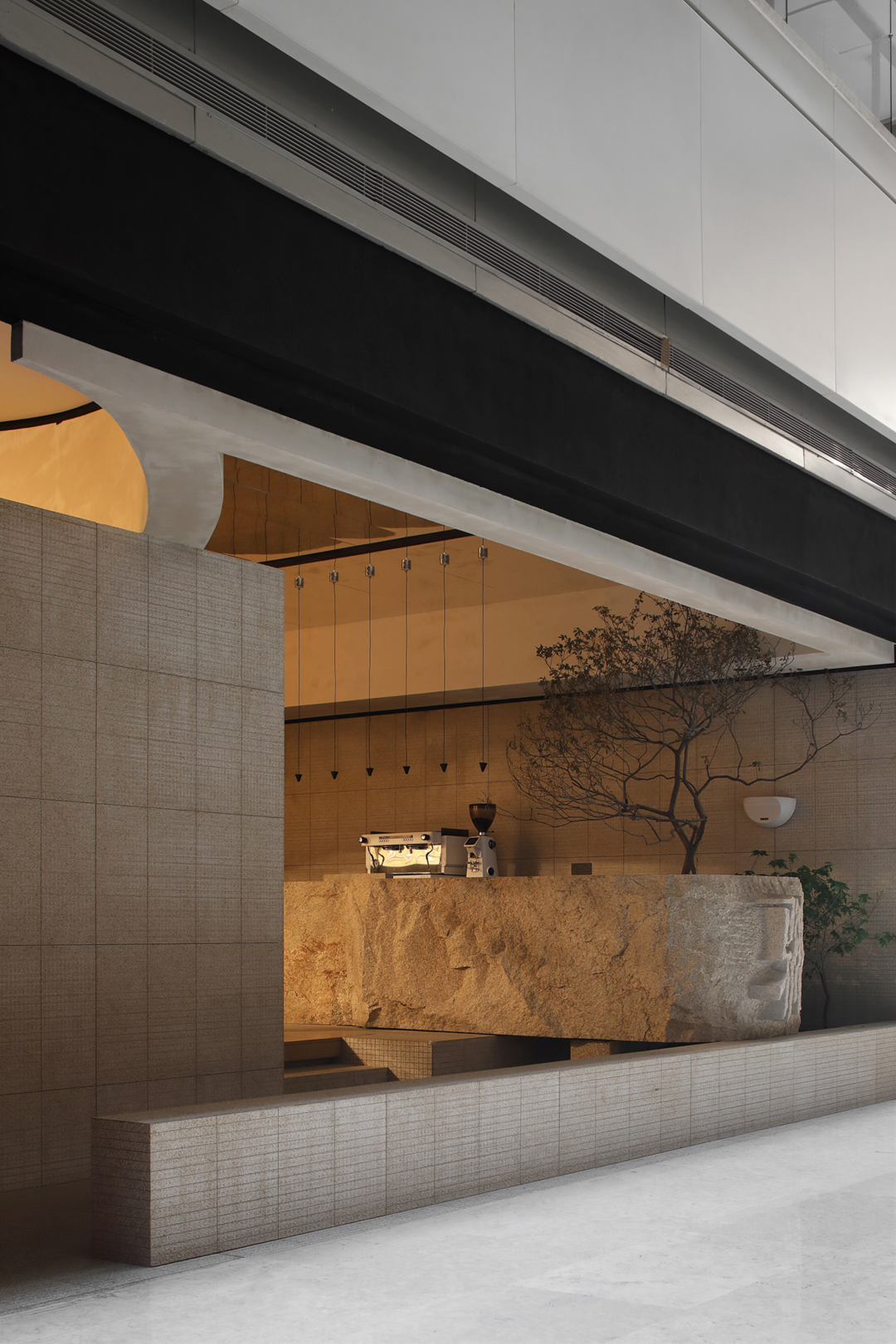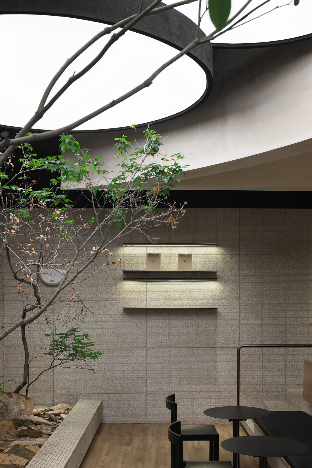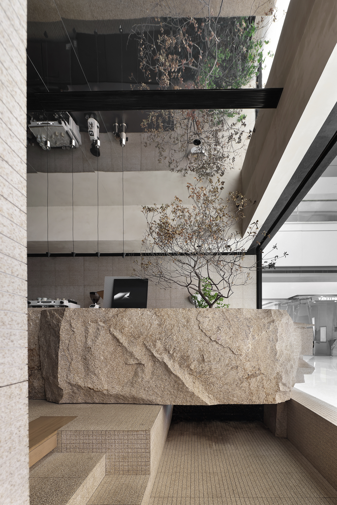 绿植摒弃端庄方正的盆景,移植整株树木,仿效自然生长在山间的翠色,天然之姿的点缀,让石质空间有了灵动的生命力。