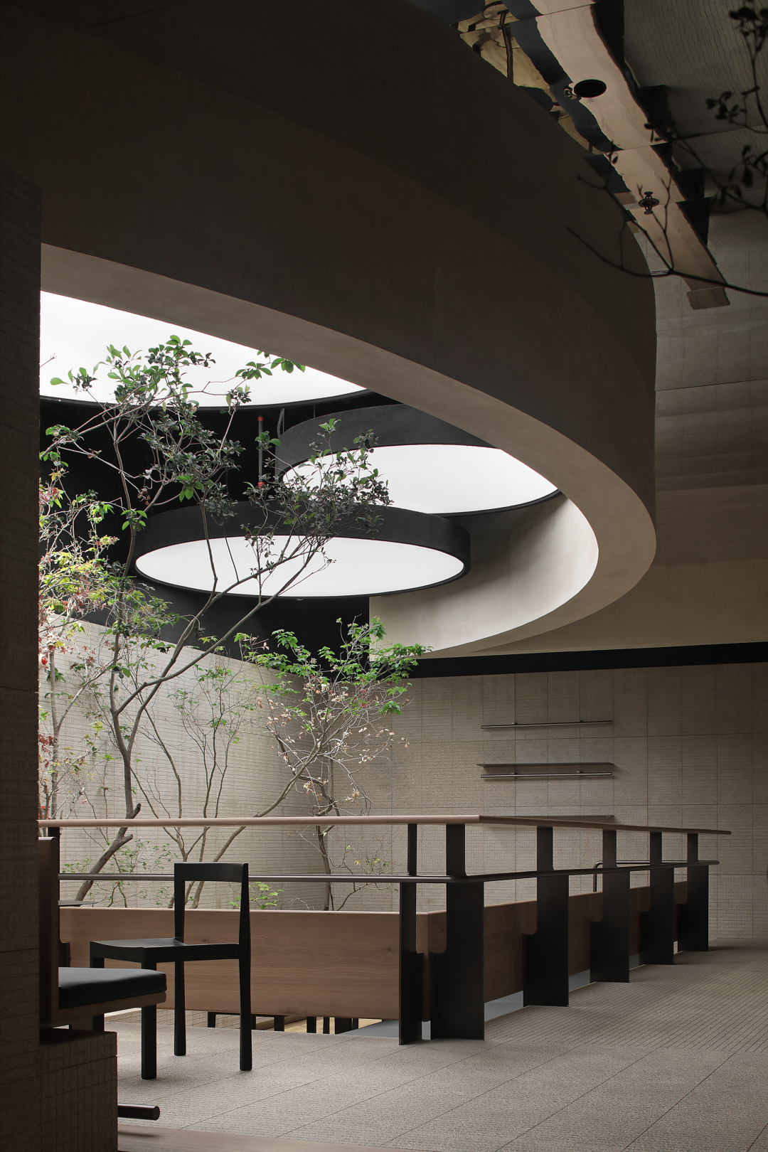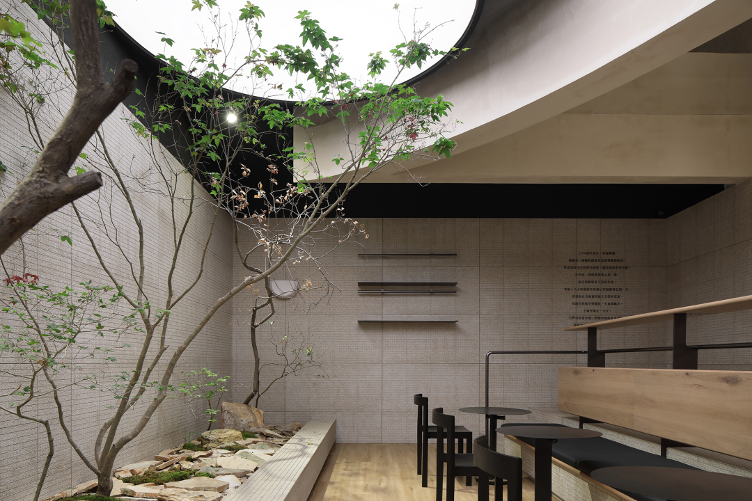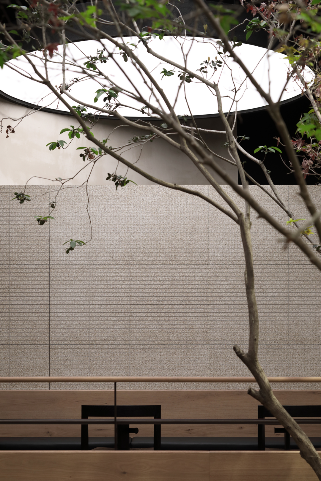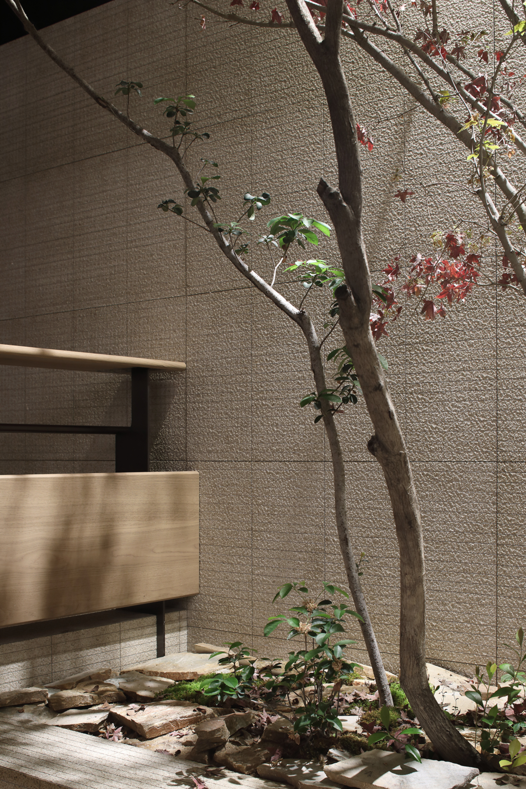 绿植摒弃端庄方正的盆景,移植整株树木,仿效自然生长在山间的翠色,天然之姿的点缀,让石质空间有了灵动的生命力。